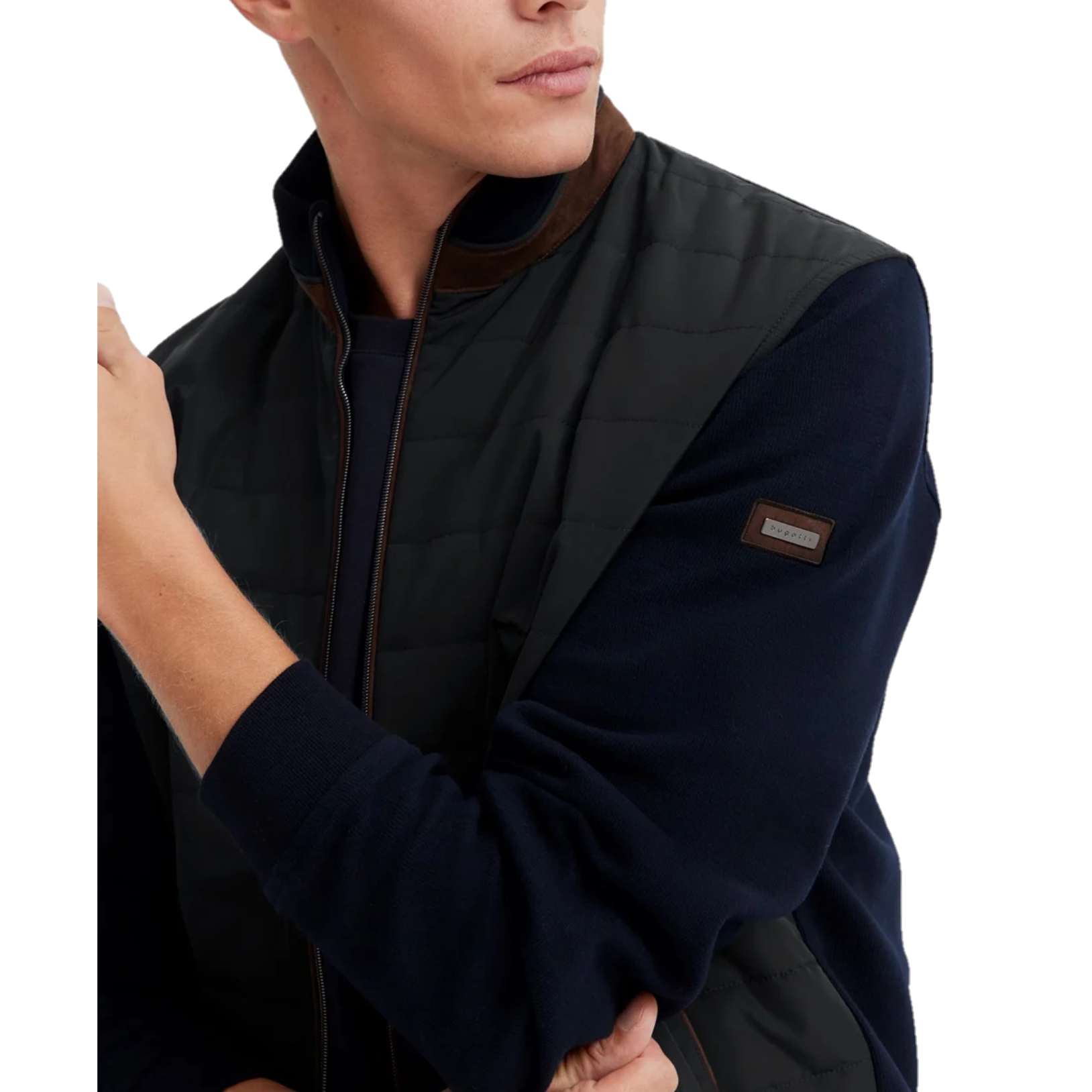 Мужской кардиган Bugatti темно-синего цвета – это стильное сочетание комфорта и практичности. Модель выполнена из хлопка с добавлением полиэстера, имеет стеганую лицевую часть и трикотажные рукава. Застежка – молния. Состав: хлопок 80%, полиэстер 20%.