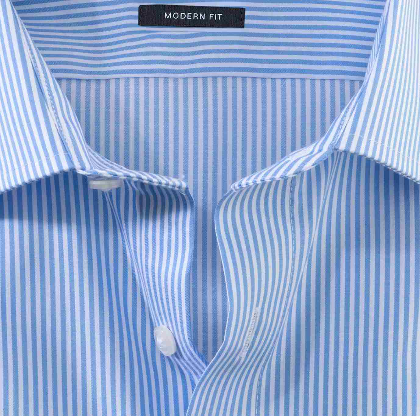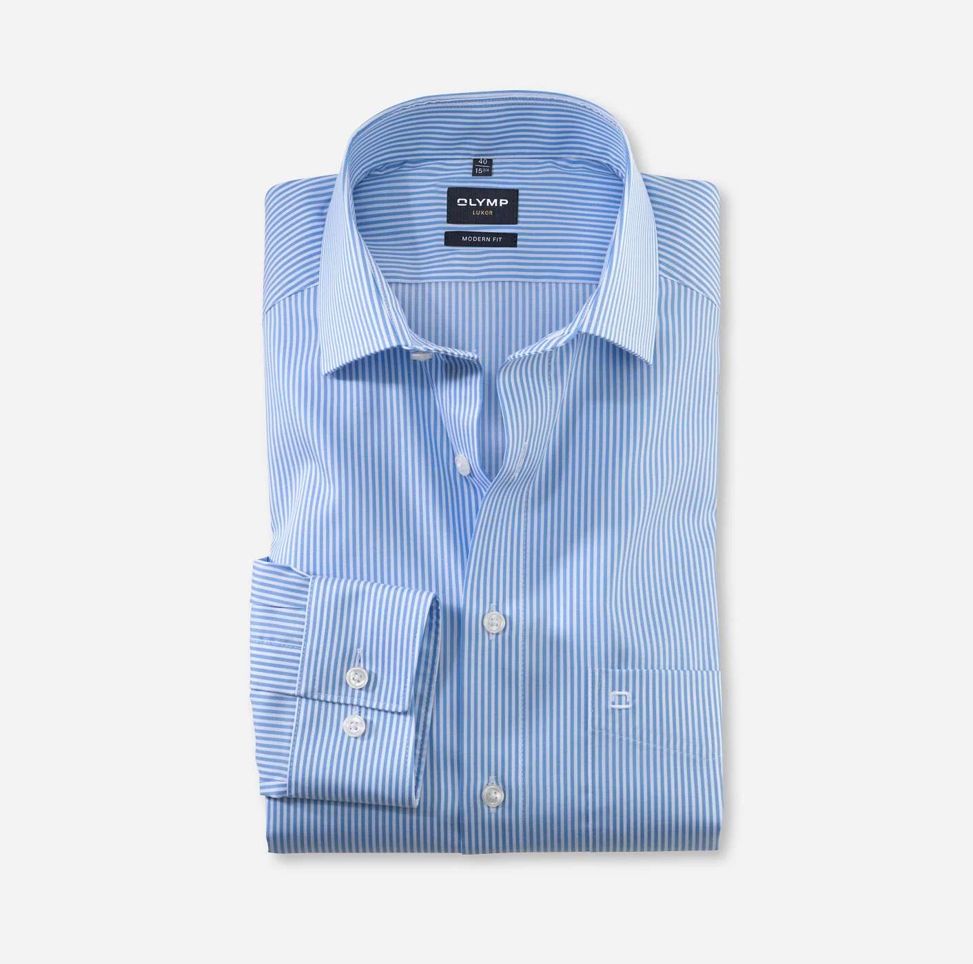 Мужская рубашка OLYMP коллекции Modern fit полуприлегающего силуэта (modern fit). Модель в голубую полоску. Деловая рубашка с длинным рукавом (64 см) рекомендуется для мужчин на рост 176-186 см. Модель с элегантным классическим воротником . Рубашка слегка зауженного кроя подчеркивает формы тела и гарантирует достаточную свободу движения, прекрасно подходит для офиса и досуга.