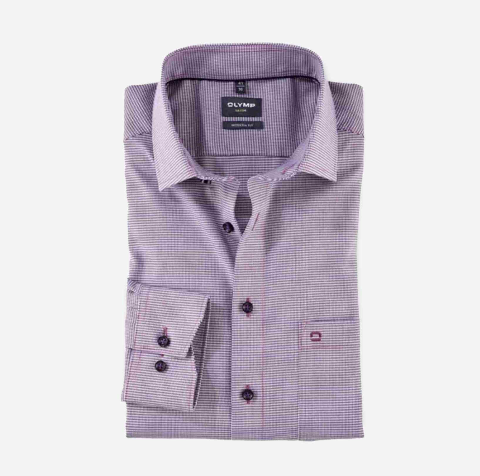 Мужская рубашка OLYMP коллекции Modern fit полуприлегающего силуэта (modern fit). Модель сливового цвета, с геометрическим рисунком. Деловая рубашка с длинным рукавом (64 см) рекомендуется для мужчин на рост 176-186 см. Модель с элегантным классическим воротником . Рубашка слегка зауженного кроя подчеркивает формы тела и гарантирует достаточную свободу движения, прекрасно подходит для офиса и досуга.