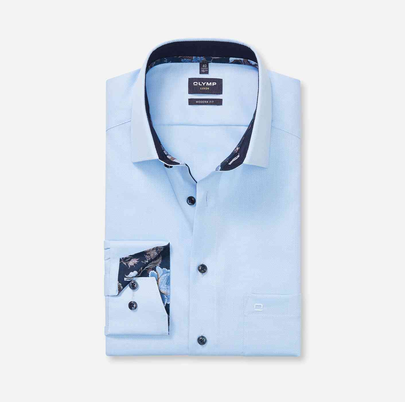 Мужская рубашка OLYMP коллекции Modern fit полуприлегающего силуэта (modern fit). Модель голубого цвета, с графическим минималистичным принтом и однотонной вставкой на манжетах. Деловая рубашка с длинным рукавом (69 см) рекомендуется для мужчин на рост 186-196 см. Модель с элегантным классическим воротником . Рубашка слегка зауженного кроя подчеркивает формы тела и гарантирует достаточную свободу движения, прекрасно подходит для офиса и досуга.